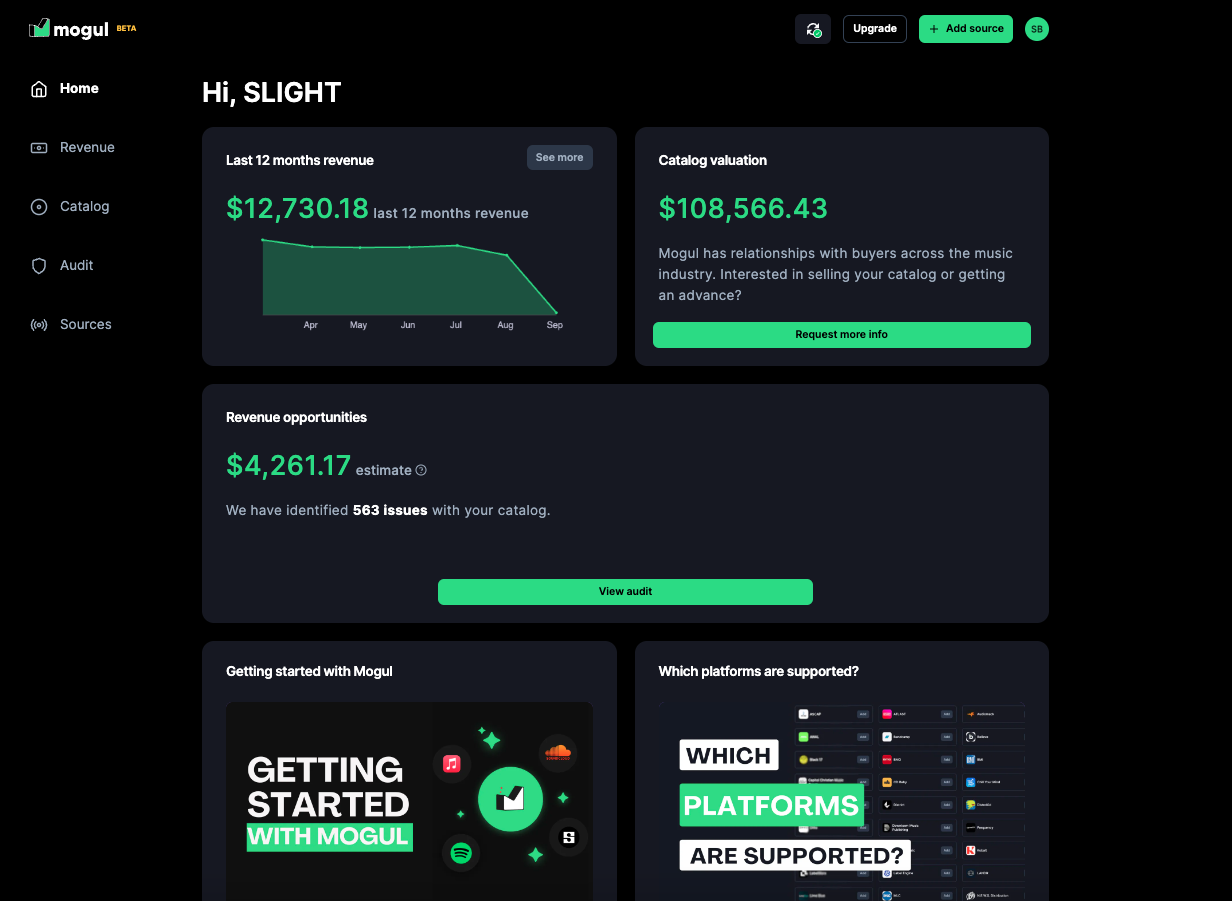 Mogul (usemogul.com) is here to banish this doubt once and for all. Founded by two music industry veterans with a passion for creator payments, Mogul ties together dozens of inputs and income streams to let artists see their entire career and business in one place, much as Rocket Money does with subscriptions. With successful artists already using the service, including Besomorph, Attack Attack!, Drama B, and Color Theory, Mogul has found more than $3.5MM in previously unidentified revenue while tracking more than $30MM—before the service has even launched.